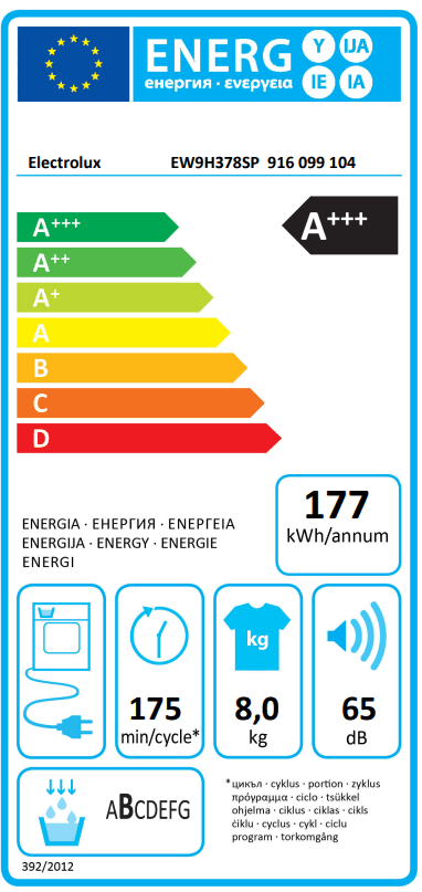 Etykieta poniżej dotyczy modelu suszarki z pompą ciepła. Urządzenie ma klasę energetyczną A+++ i czas trwania suszenia dla programu testowego wynosi 175 minut. Roczne zużycie energii tego modelu suszarki z pompą ciepła wynosi 177 kWh/rocznie