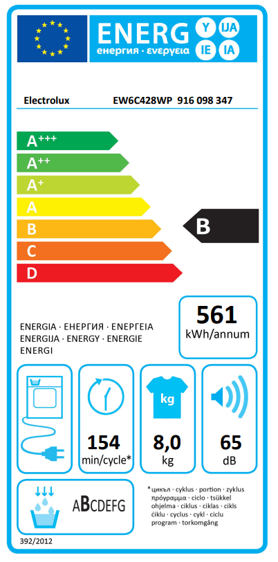 Etykieta poniżej dotyczy modelu suszarki kondensacyjnej. Urządzenie ma klasę energetyczną B i czas trwania suszenia dla programu testowego wynosi 154 minuty. Roczne zużycie energii tego modelu suszarki bez pompy ciepła wynosi 561 kWh/rocznie.
