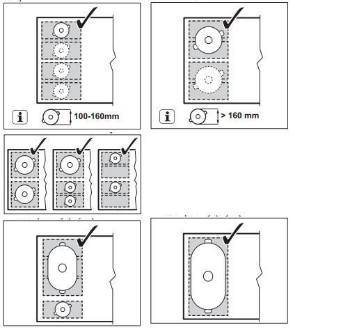 - W zależności od wybranego ustawienia możliwe jest wiele różnych rozkładów garnków na polu płyty indukcyjnej FlexiBridge