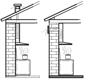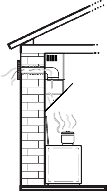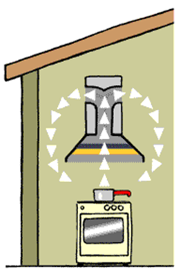 | Jest to najbardziej wydajny system, opary odprowadzane są kanałem prowadzącym na zewnątrz. Ponieważ system ten usuwa powietrze z pomieszczenia, konieczny jest dopływ świeżego powietrza do pomieszczenia. Tłuszcz i opary są najpierw oczyszczane przez filtr przeciwtłuszczowy, a następnie odprowadzane kanałem bezpośrednio na zewnątrz. |  |