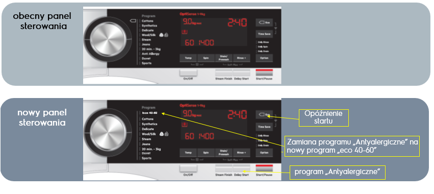 - Zmiany w panelu sterowania są związane z dodaniem obowiązkowego programu "eco 40-60". W tym celu przenieśliśmy niektóre programy / opcje: program "Antyalergiczne" został przeniesiony na przycisk "Opóźnienie startu", który z kolei został przeniesiony do przycisku opcji Eco. Podsumowując, zastępujemy jeden program ekologiczny innym.