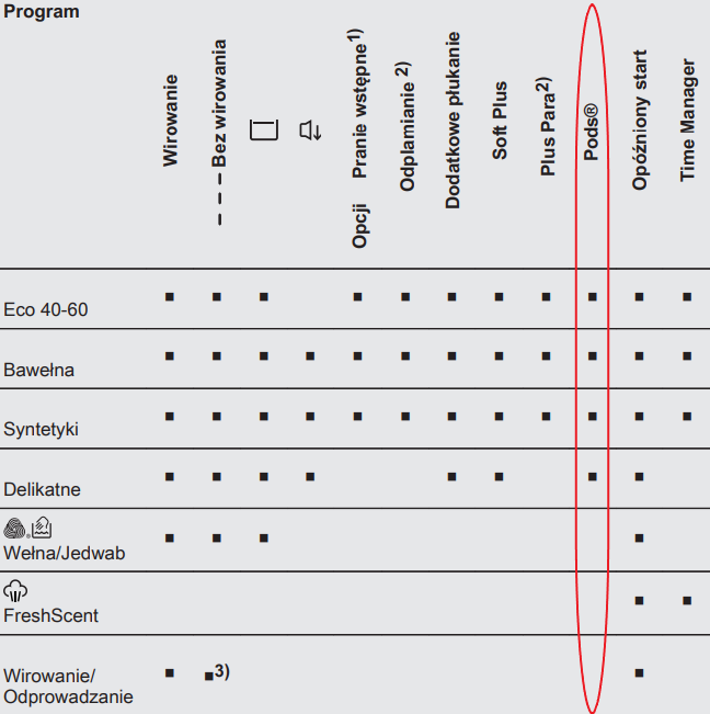Korzystaj z opcji Pods® w swojej pralce, aby cieszyć się wygodnym i efektywnym praniem. Pamiętaj o przestrzeganiu zaleceń producenta detergentu w celu osiągnięcia najlepszych wyników prania. Opcja Pods® sprawi, że Twoje pranie będzie jeszcze łatwiejsze i bardziej efektywne, zapewniając doskonałe rezultaty w każdym cyklu prania.
