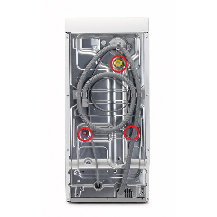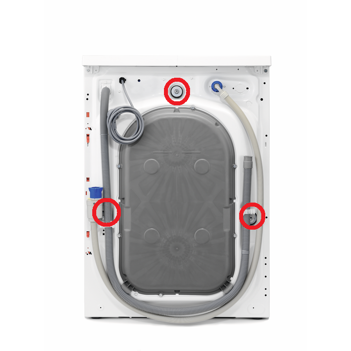 Przed rozpoczęciem korzystania z urządzenia pralniczego konieczne jest odkręcenie blokad transportowych, które umieszczone są "na plecach" urządzenia. Blokady te mają formę śrub, zaznaczone są na poniższych zdjęciach kolorem czerwonym.