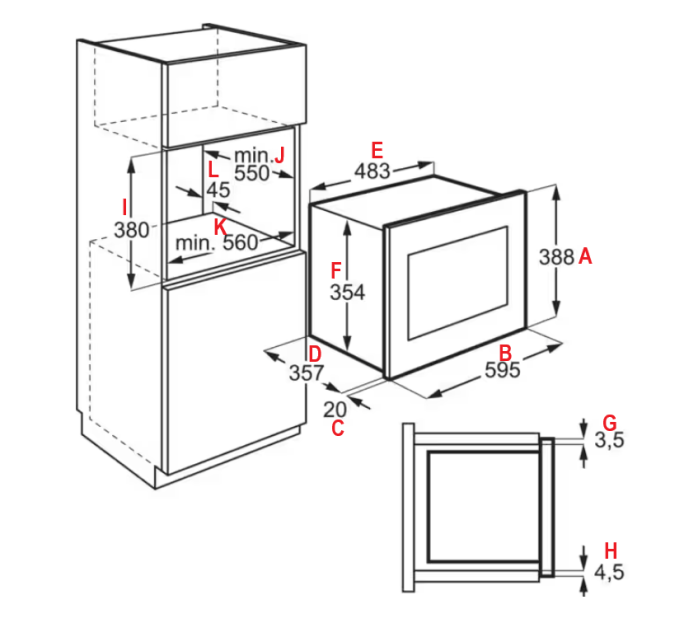 H - nachodzenie obudowy na dno szafki w której zabudowana jest mikrofala (wynika ze sposobu montażu)