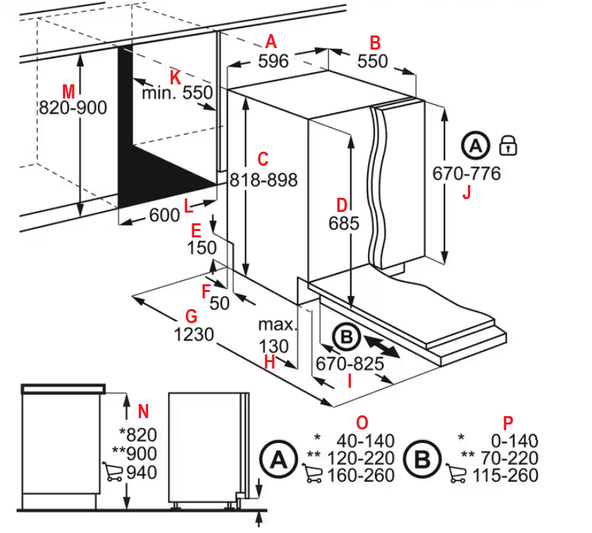 K - minimalna głębokość szafki/ wnęki, w którą montowana jest zmywarka