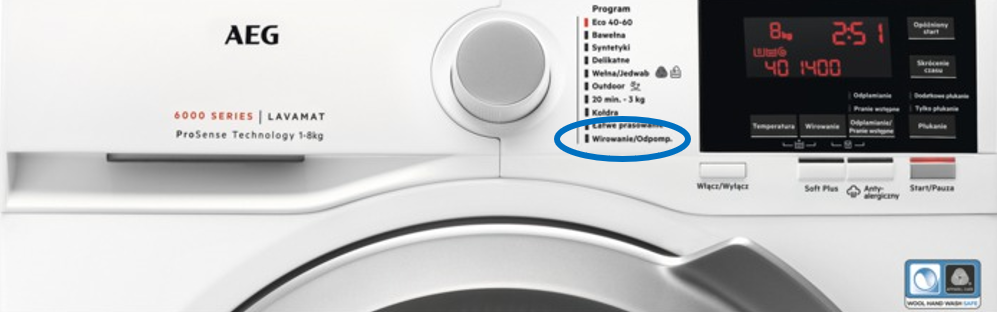 W niektórych pralkach marki AEG istnieje możliwość uruchomienia wirowania jako oddzielnego programu. Najczęściej znajduje się on pod nazwą Wirowanie/Odpompowywanie.